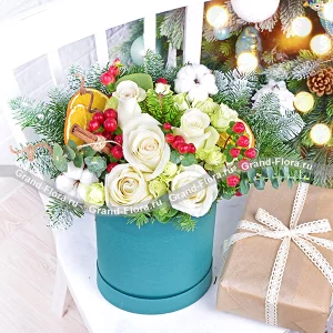 Снежные хлопья - коробка с белыми розами и гиперикумом