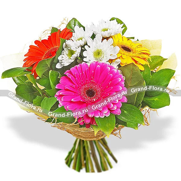 Роскошная композиция из ярких герберов в комбинации с нежными хризантемами и лепестками зелени олицетворяет собой праздничное настроение, симфонию мира и добра. Букет станет изысканным презентом по любому поводу. Изысканные оттенки цветов передадут все многообразие эмоций: радость встречи и горечь расставания, новые чувства или сильную привязанность.