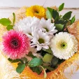 Стандартный (на фото): герберы разноцветные - 3 шт., хризантема кустовая белая - 1 шт., салал, фетр желтый, натуральная упаковка.