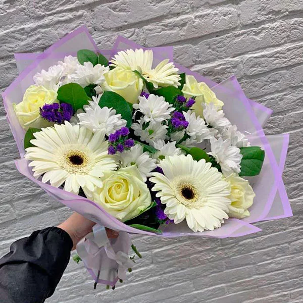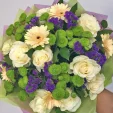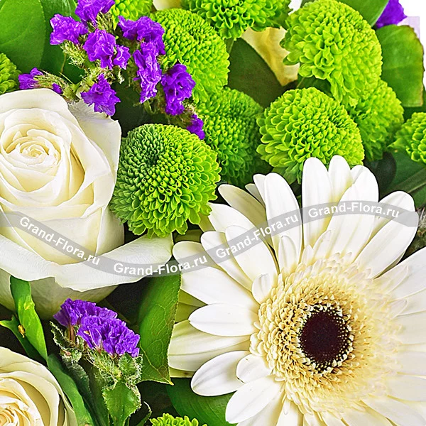 роза белая - 15 шт, гербера белая - 9 шт, хризантема кустовая зеленая - 10 шт, статица - 7 шт, салал, фетр из двух слоев - зеленый и фиолетовый, лента. Примерный размер: 45Х45 см.
