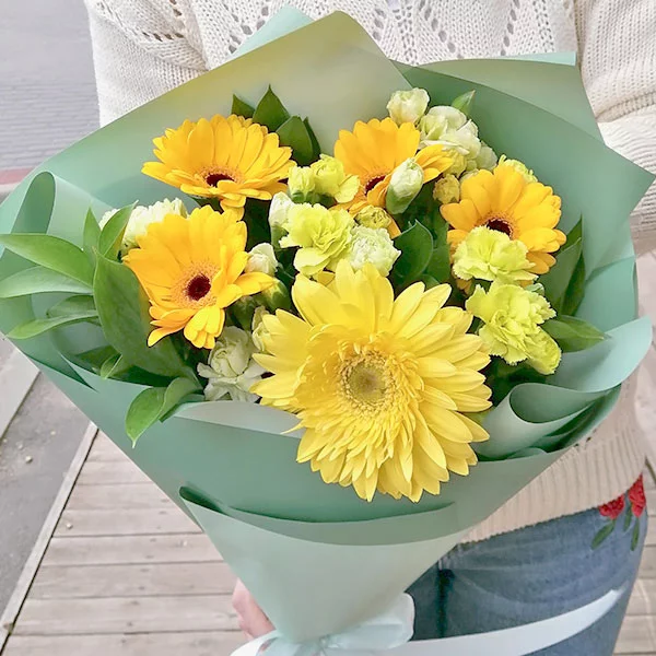 ДЕЛЮКС: гербера желтая - 9 шт., хризантема кустовая зеленая - 10 шт., берграсс, рускус, фетр зеленый.