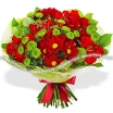 ДЕЛЮКС: хризантема кустовая красная - 7 шт., хризантема зеленая кустовая - 5 шт., роза красная кустовая - 6 шт., салал, фетр зеленый.