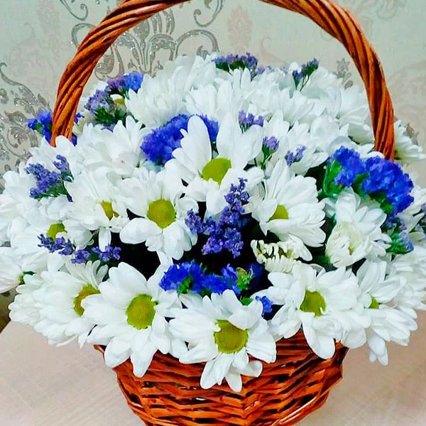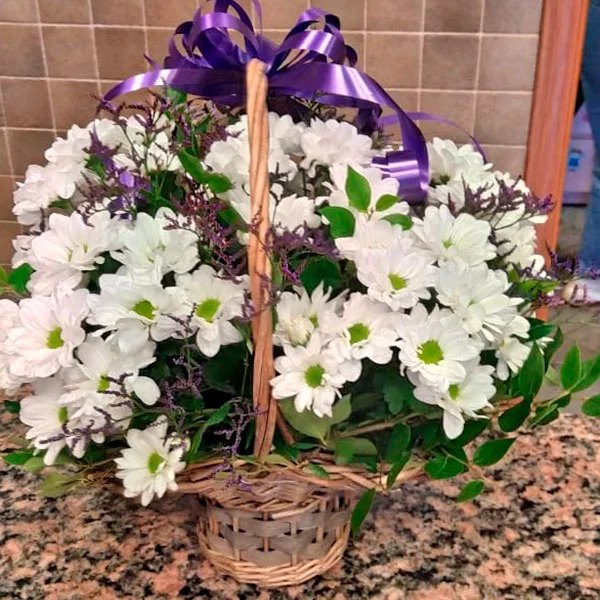 Стандартный: хризантема белая кустовая ромашковидная - 9 шт., статица - 4 шт., декоративная зелень, оазис, корзина средняя.