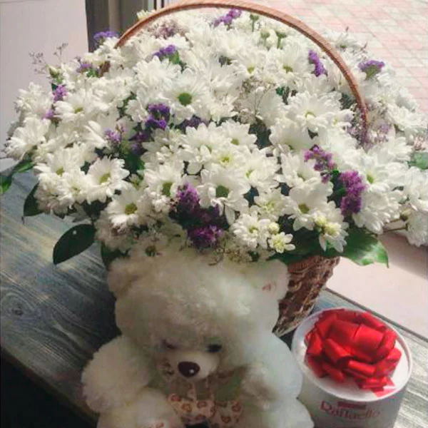 Букет из хрупких цветов, помещенный в плетеную корзинку, является не только чрезвычайно привлекательным, но и оригинальным презентом. Изящные белоснежные хризантемы подойдут к любому торжеству, будь то свадьба друзей, юбилей или день рождения любимой девушки. Также букет станет великолепным решением для вручения маме или сестре на 8 марта.
