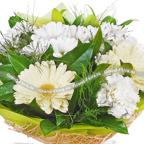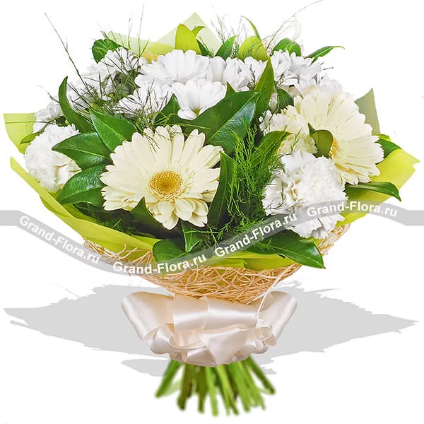 Стандартный: гербера кремовая - 5 шт., гвоздика белая - 4 шт., хризантема кустовая белая - 2 шт., декоративная зелень, фетр зеленый, сетка натуральная, бант кремовый.