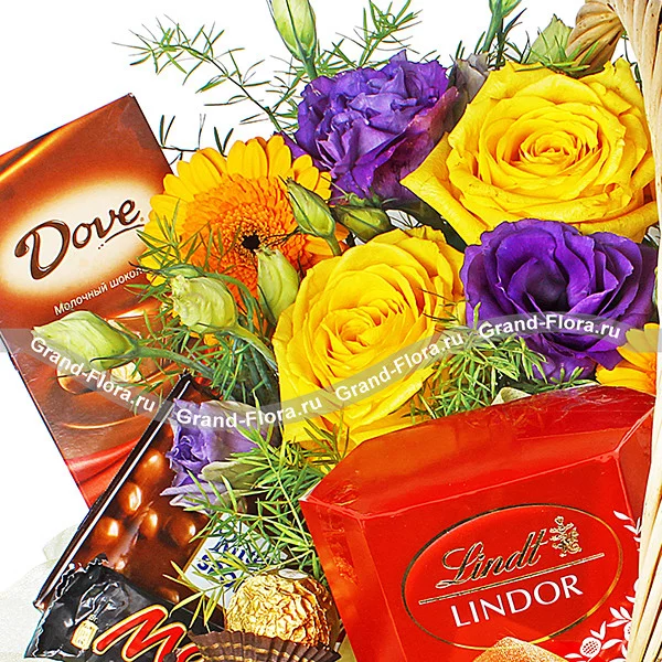 Стандартный: Snikers - 2 шт., Mars - 2 шт., Twix - 1 шт., конфеты "Ferrero Rocher" - 1 шт., шоколад "DOVE" - 1 шт., шоколад "Коркунов" - 1 шт., шоколад "Ritter sport" - 2 шт., конфеты "Lindor" - 1 шт., роза - 3 шт., эустома - 2 шт., герберы - 3 шт., декоративная зелень, оазис, декор, средняя корзина.