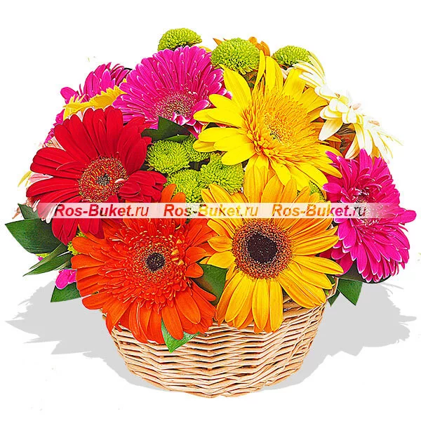 Уменьшенный: герберы разноцветные (желтые, красные, оранжевые, белые малиновые, розовые) - 7 шт, хризантема кустовая зеленая - 1 шт, рускус, оазис, корзина без ручки.