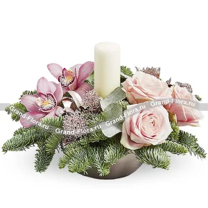 Новогодняя мечта - букет с розами и хризантемами, новогодний декор