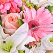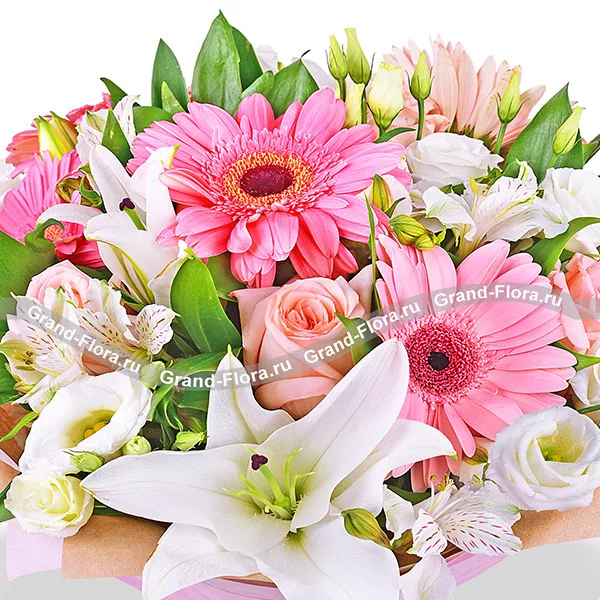 Утонченный  микс состоит из элегантных розовых роз, пленительных белых эустом, шикарных лилий и альстромерий, а также из гербер в тон розам. Букет превосходно подойдет на подарок дорогой маме, а также любимой девушке в честь дня рождения.В довершении, можете  преподнести его молодоженам в день свадьбы - они по достоинству оценят изящность композиции.