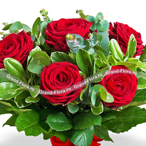 5 роз: роза красная - 5 шт., рускус - 3 шт., эвкалипт - 2 шт., упаковка, бант красный.