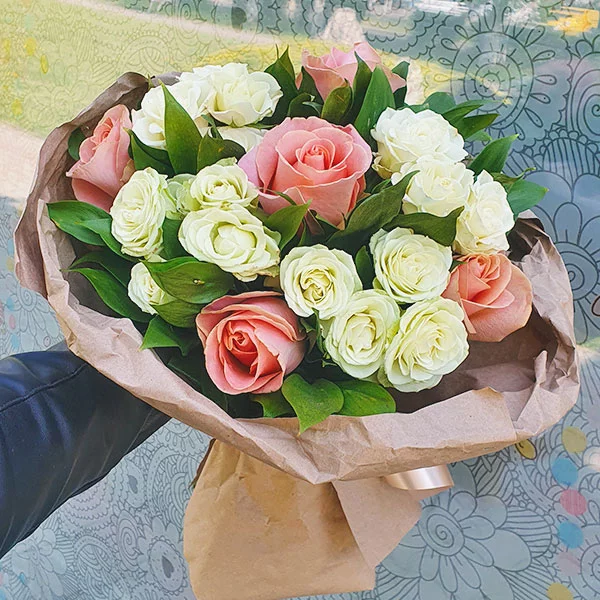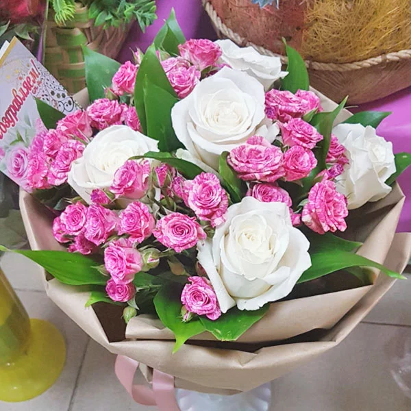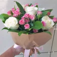 роза белая - 15 шт., роза кустовая розово-белая (возможна замена на розовую/малиновую) - 8 шт., декоративная зелень, упаковка крафт, лента кремовая. Примерный размер: 35Х35 см.