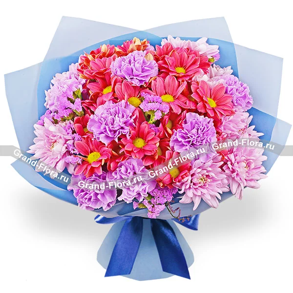 Стандартный: гвоздика фиолетовая - 4 шт., хризантема кустовая красная - 2 шт., хризантема кустовая фиолетовая - 3 шт., статица, упаковка, лента.