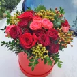 Букет собран из роз сорта Red France, отличающихся своим притягательным цветом, кустовых роз сорта Golden Perl, огненного оттенка и манящих красных кустовых роз , кустовые хризантемы, более светлого оттенка разбавляют розарий, а вкрапления гиперикума и статицы идеально завершают картину.Композиция выполнена в шляпной коробке на оазисе. Диаметр композиции от 20см до 30см. Обращаем Ваше внимание, что состав и оформление может отличаться.