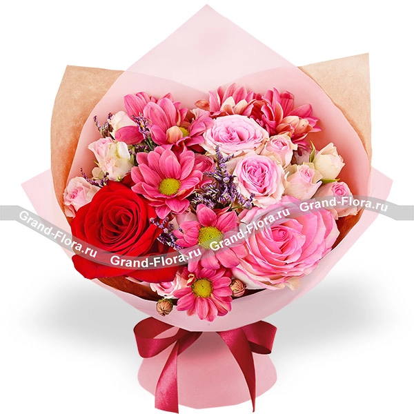 роза красная - 1 шт., роза розовая - 2 шт., кустовая роза розовая - 1 шт., хризантема кустовая розовая - 1 шт., лимониум, упаковка, лента.