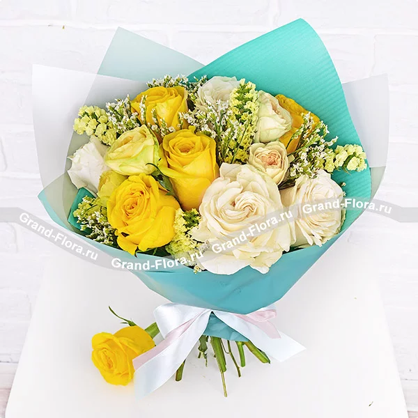Уменьшенный: роза белая - 3 шт., роза желтая - 3 шт., роза кустовая желтая - 1 шт., декоративная зелень, упаковка, лента. *Возможна замена кустовой розы на один оттенок (только белые или только желтые),декоративная зелень может отличаться от фото.
