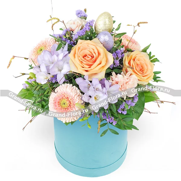 Стандартный: гербера розовая - 3 шт., гвоздика персиковая - 3 шт., роза персиковая - 3 шт., фрезия - 2 шт., статица, декоративная зелень, пасхальный декор, оазис, коробка.