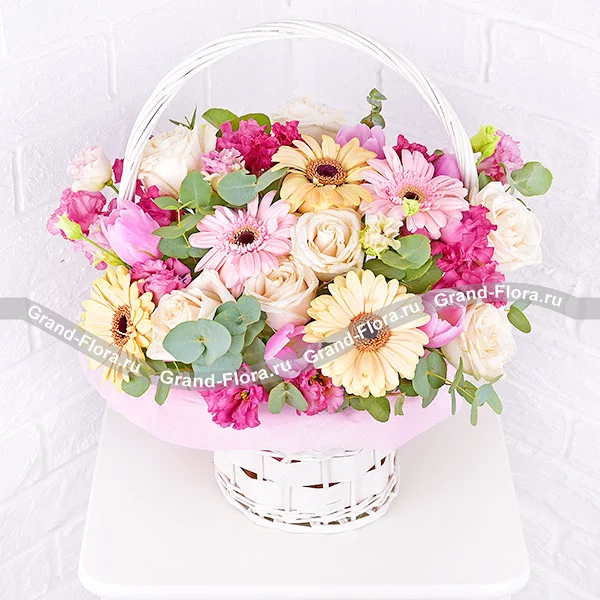 Стандартный: роза белая - 4 шт., гербера розовая - 1 шт., гербера желтая - 2 шт., тюльпан розовый - 3 шт., эустома розовая - 3 шт., эвкалипт, оазис, корзина. Примерный размер: 25Х30 см.