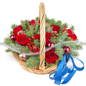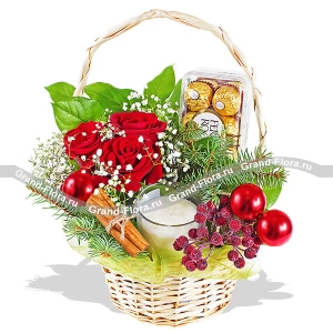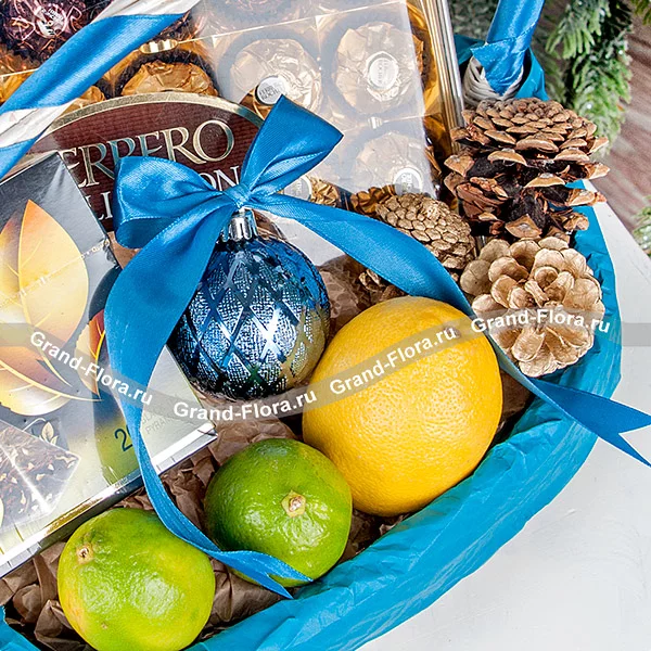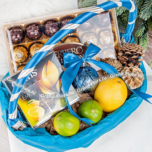 Уменьшенный: чай "Curtis"- 20 пак., конфеты "Ferrerro Roсher" - 200 гр., лайм - 2 шт., лимон - 1 шт., шишки - 1 шт., шарики - 1 шт., корзина малая.