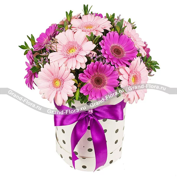 Встреча двух сердец - коробка с розовыми и малиновыми герберами (акционное предложение)