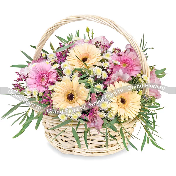 хризантема мини кустовая белая - 6 шт., гербера желтая - 5 шт., гербера розовая - 4 шт., эустома розовая - 4 шт., декоративная зелень, оазис, корзина.