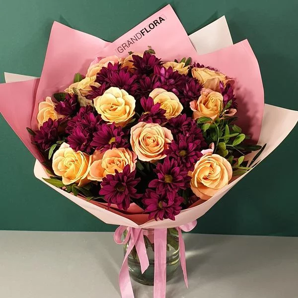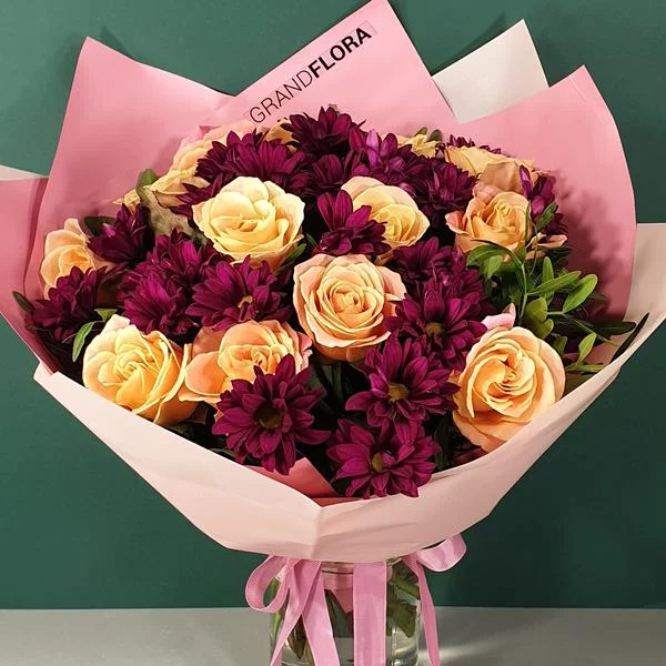 Стандартный: роза кремовая/персиковая(персиково-розовая) - 5 шт., хризантема фиолетовая - 4 шт., декоративная зелень, упаковка, лента. Примерный размер: 25Х25 см.