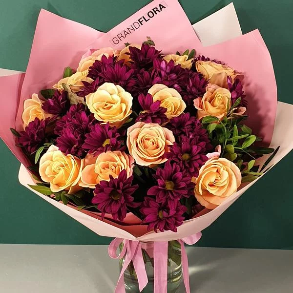 ЛЮКС (на фото): роза кремовая/персиковая(персиково-розовая) - 15 шт., хризантема фиолетовая - 8 шт., декоративная зелень, упаковка, лента Примерный размер: 35Х35 см.