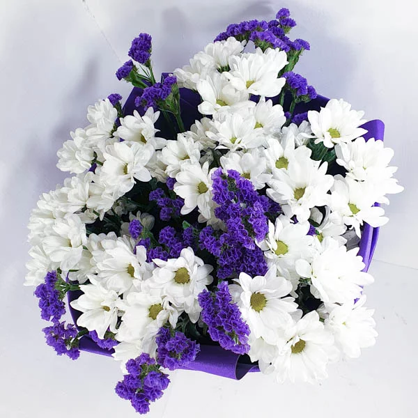 хризантема белая кустовая ромашковая - 15 шт., статица - 8 шт., салал, фетр фиолетовый.  Примерный размер: 40Х40 см.