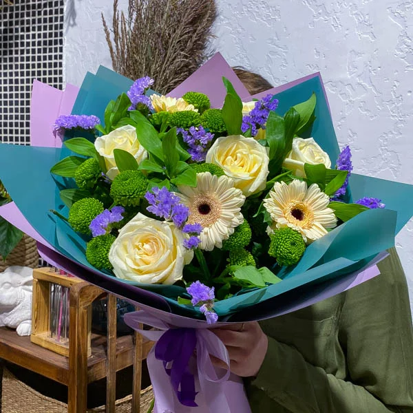 Нежную композицию, составленную из светлых роз и гербер, превосходно подчеркивает кустовая зеленая хризантема. Особое очарование и выразительность придает статица. Яркий фиолетовый букет великолепно подойдет для того, чтобы поздравить коллегу с дня рождения или любым другим торжеством.