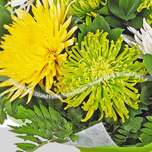 Стандартный (на фото):хризантема зеленая - 3 шт., хризантема желтая - 3 шт., хризанетема белая - 3 шт., декоративная зелень, сетка.
