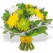 Уменьшенный:хризантема зеленая - 1 шт., хризантема желтая - 1 шт., хризанетема белая - 1 шт., декоративная зелень, сетка.